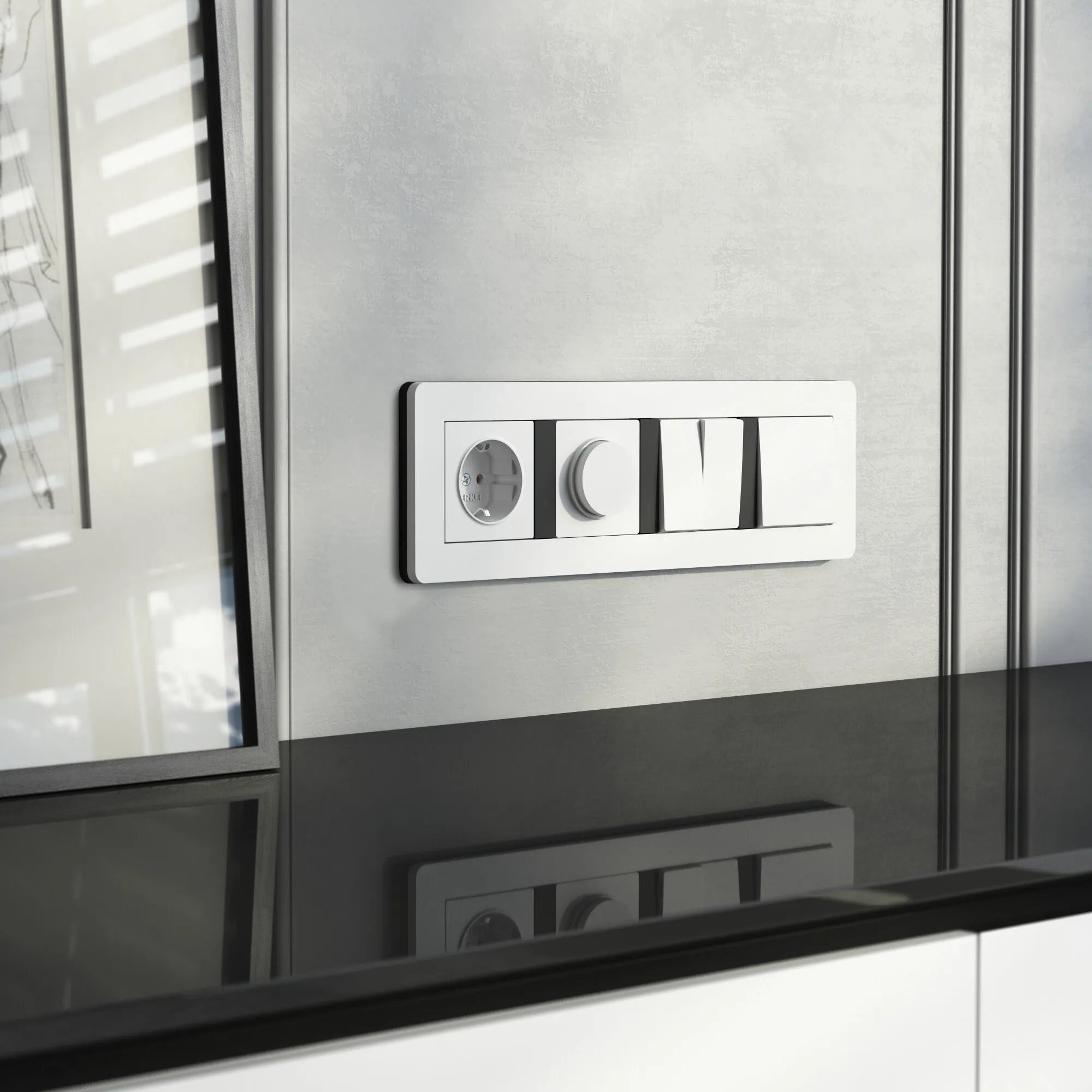Коллекция Split переосмысливает привычные электроустановочные изделия, превращая их в элементы современного декора. Благодаря продуманному сочетанию цветов, форм и тактильных ощущений, рамка белый/чёрный становится не просто обрамлением, а визуальным фокусом на стене.